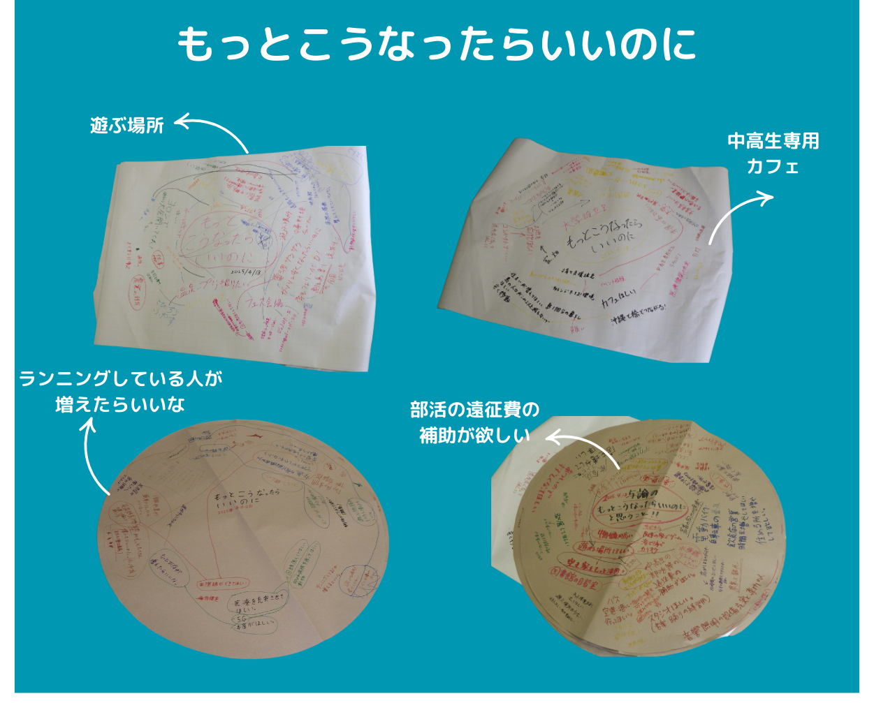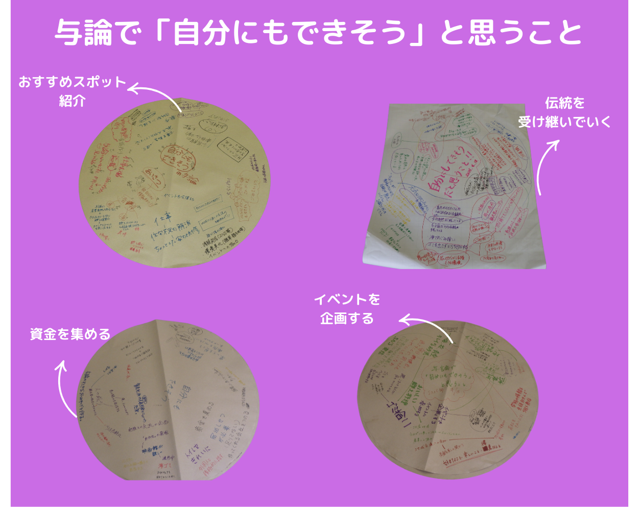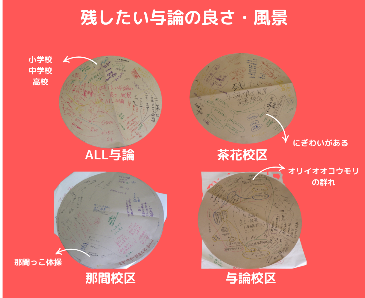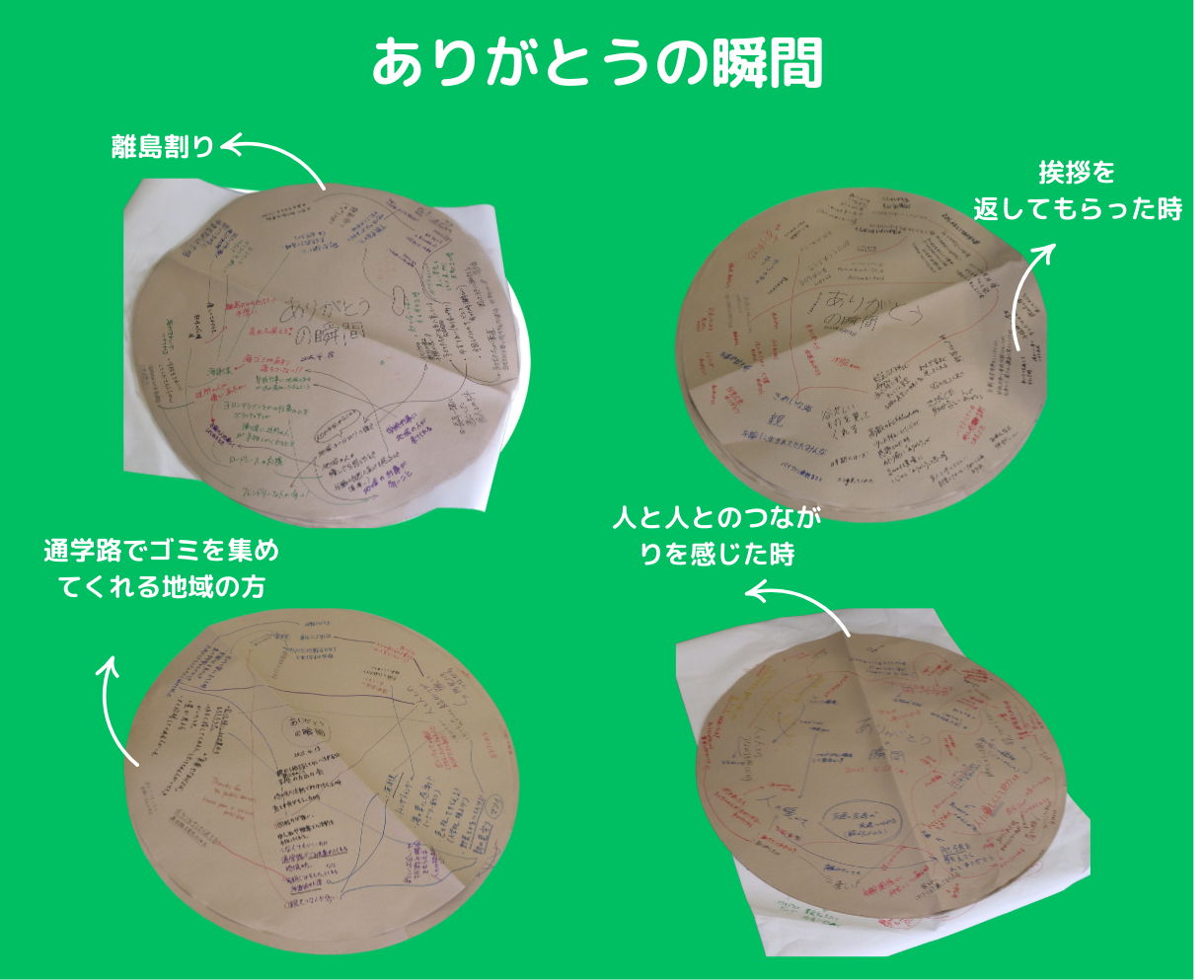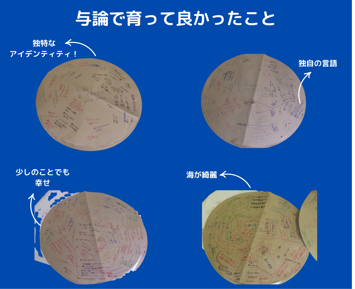 シンポジウムの目玉イベント「探究ワールドカフェ」では、地域サポーター21名が参加し、生徒と地域住民が世代を超えて対話を交わしました。話題は、与論で“誰かにありがとう”と言いたくなる瞬間や、“育ってよかった”と感じる経験、“未来に残したい与論の良さや風景”、“もっとこうなったらいいのに”という地域への願い、そして“自分にもできそう”と思える地域での行動について。