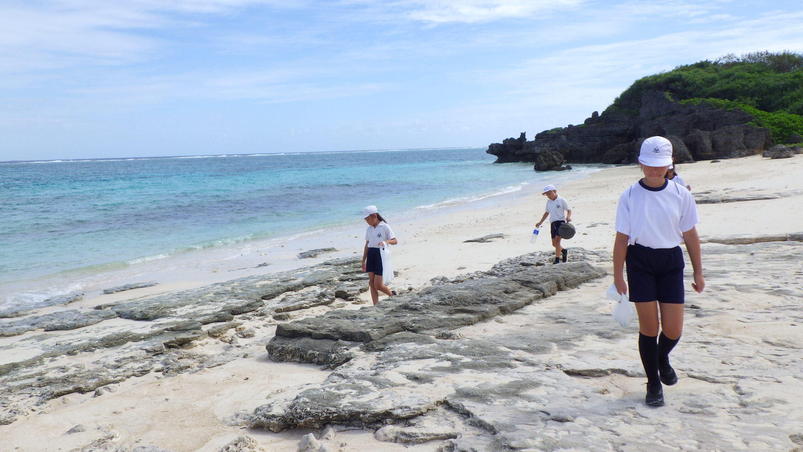 児童たちは貝殻やシーグラス、サンゴなどを手に取り「きれい」「こんな形の貝があるんだ」などと興味津々。次のゆんぬ学の授業のためにシーグラスやマイクロプラスチックなどを拾いました。そしてビーチで拾ったゴミは「拾い箱」へ入れました。