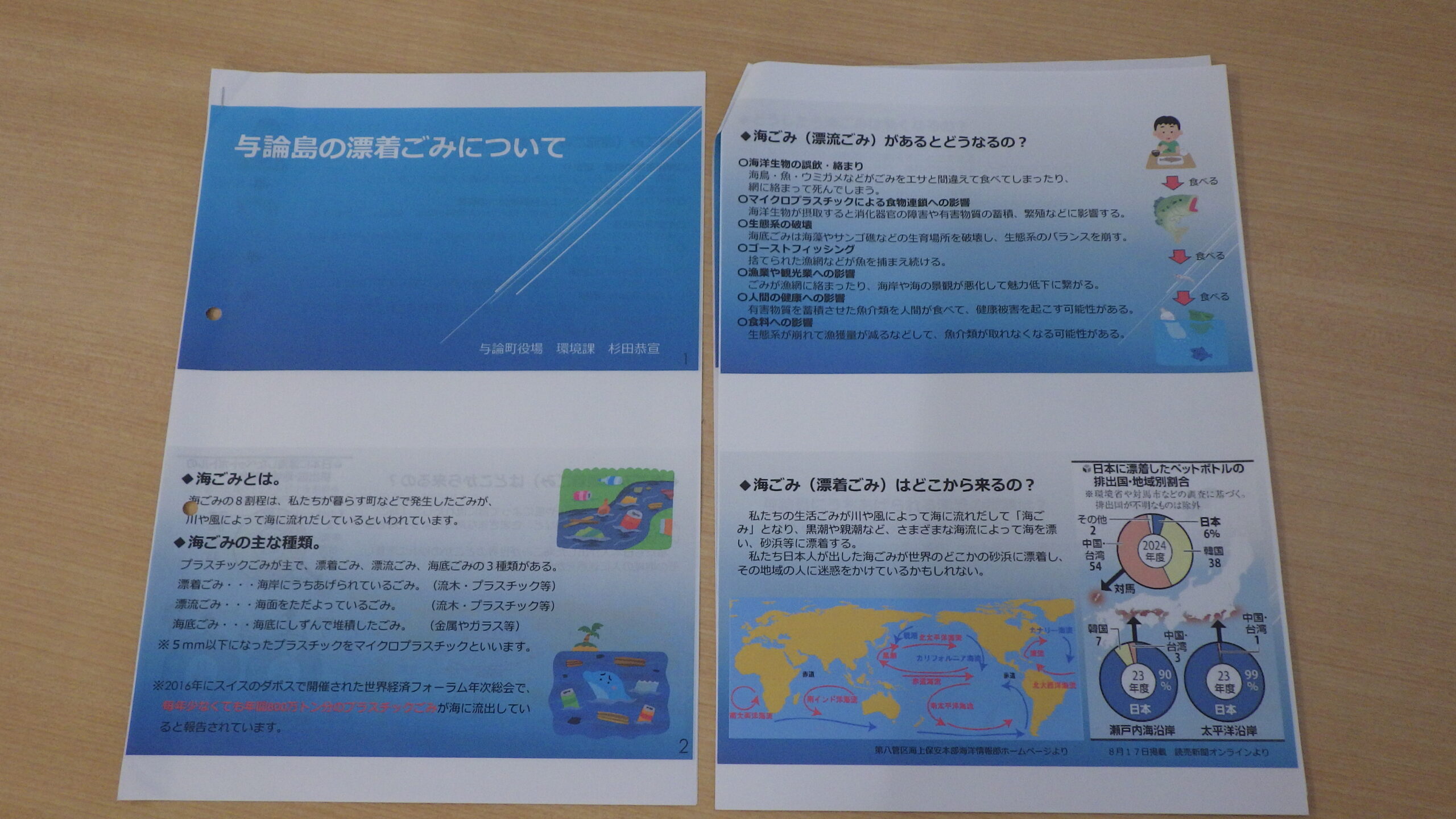 授業では、海ゴミがあると実際どのような影響があるのかなど、知っているようで知らなかったことを詳しくお話しして頂きました。世界中の海に流れ出ているごみの種類や量、そしてそれが生き物や私たちの生活にどのような影響を与えているのか、与論町での対応、対策についてなど学びました。