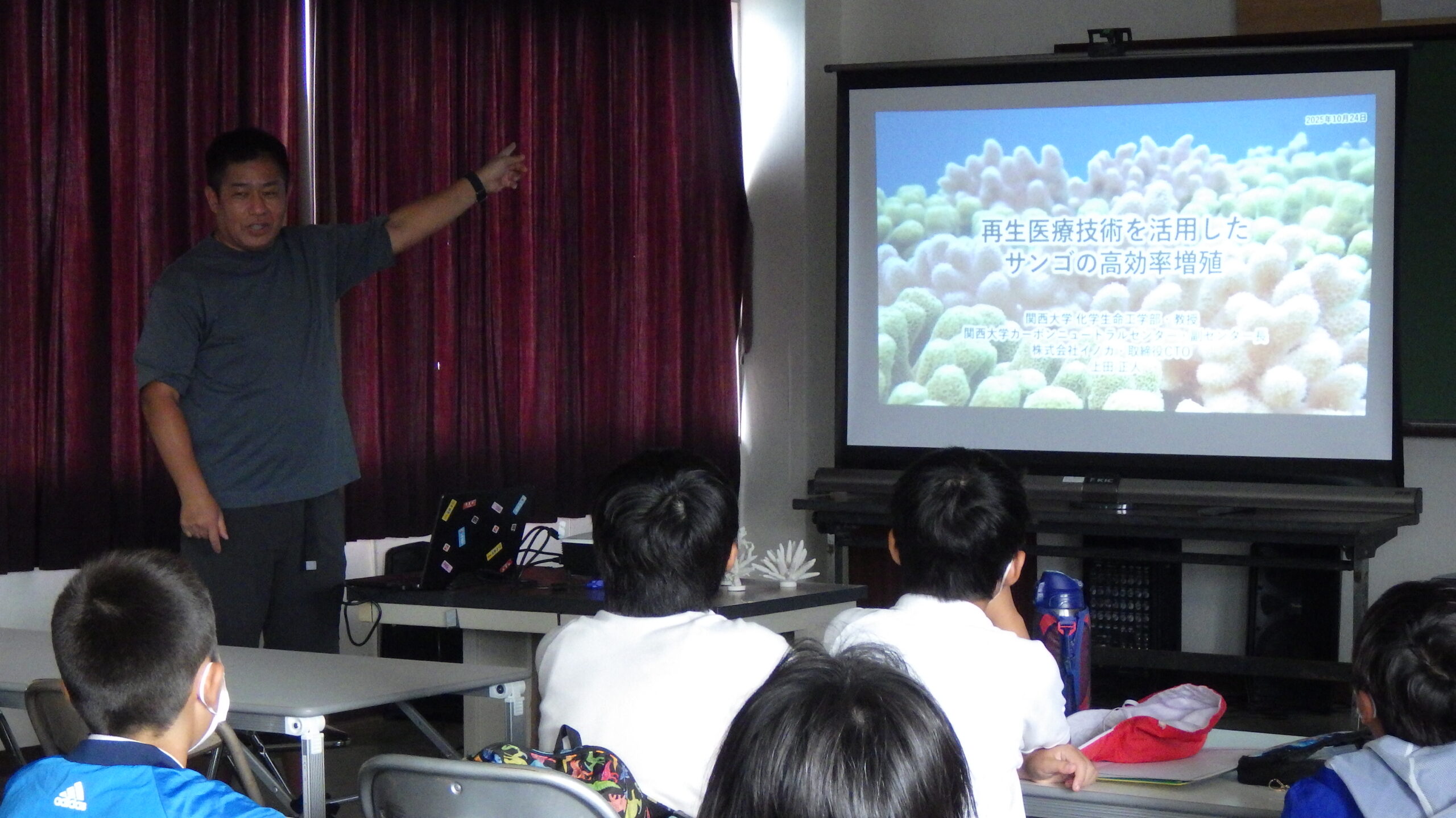 当日は上田正人教授から「再生医療の技術をサンゴ再生に生かす」という最先端の取り組みについてご講話いただきました。専門的な内容を、子どもたちにも理解できるように丁寧に説明してくださり、サンゴを守るための新しい視点に触れる貴重な時間となりました。