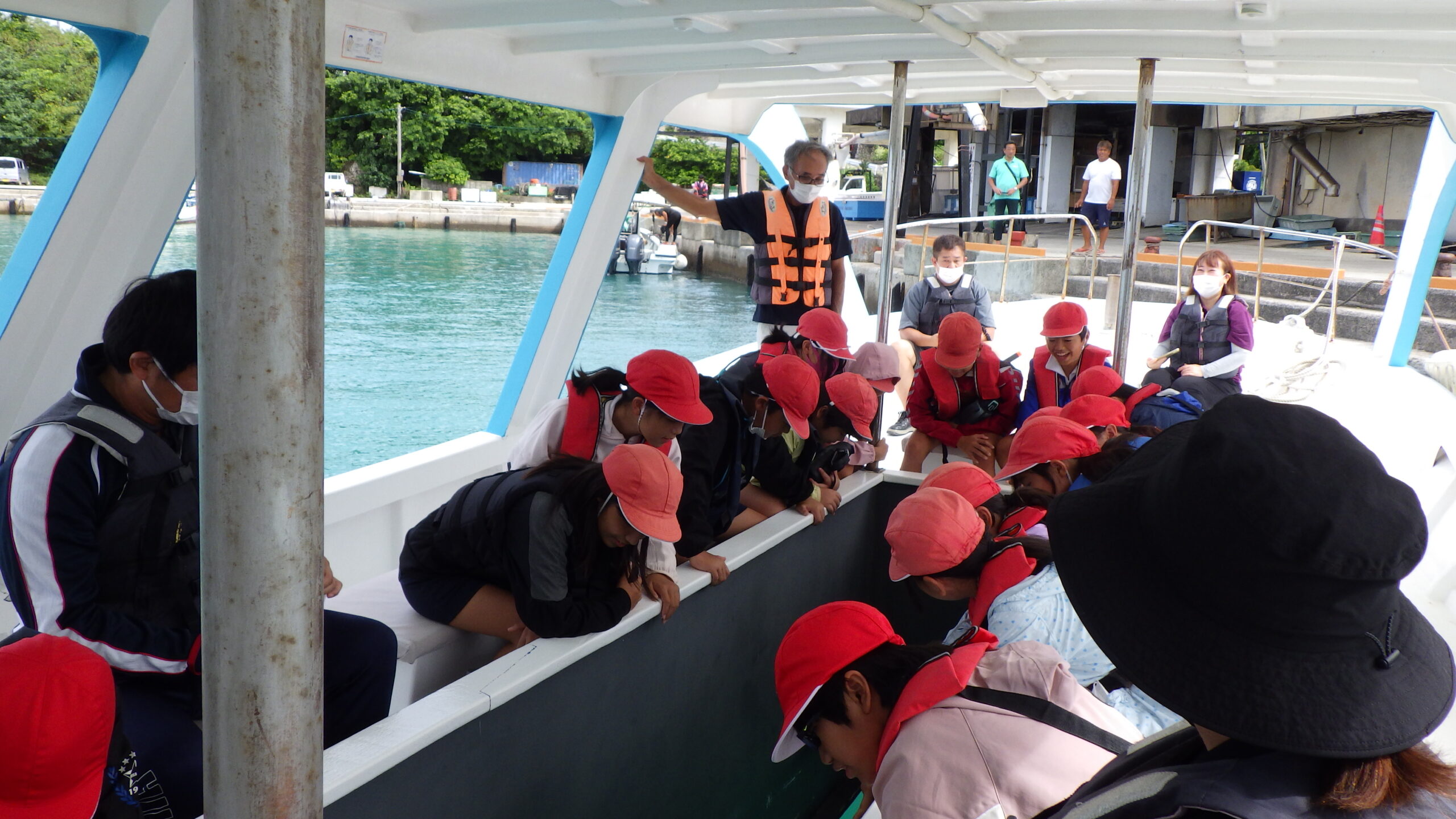 サンゴ増殖体験・経過観察(茶花小5年生、与論小5年生)、漁協の“ウラガワ”ツアー(那間小4・5年生)