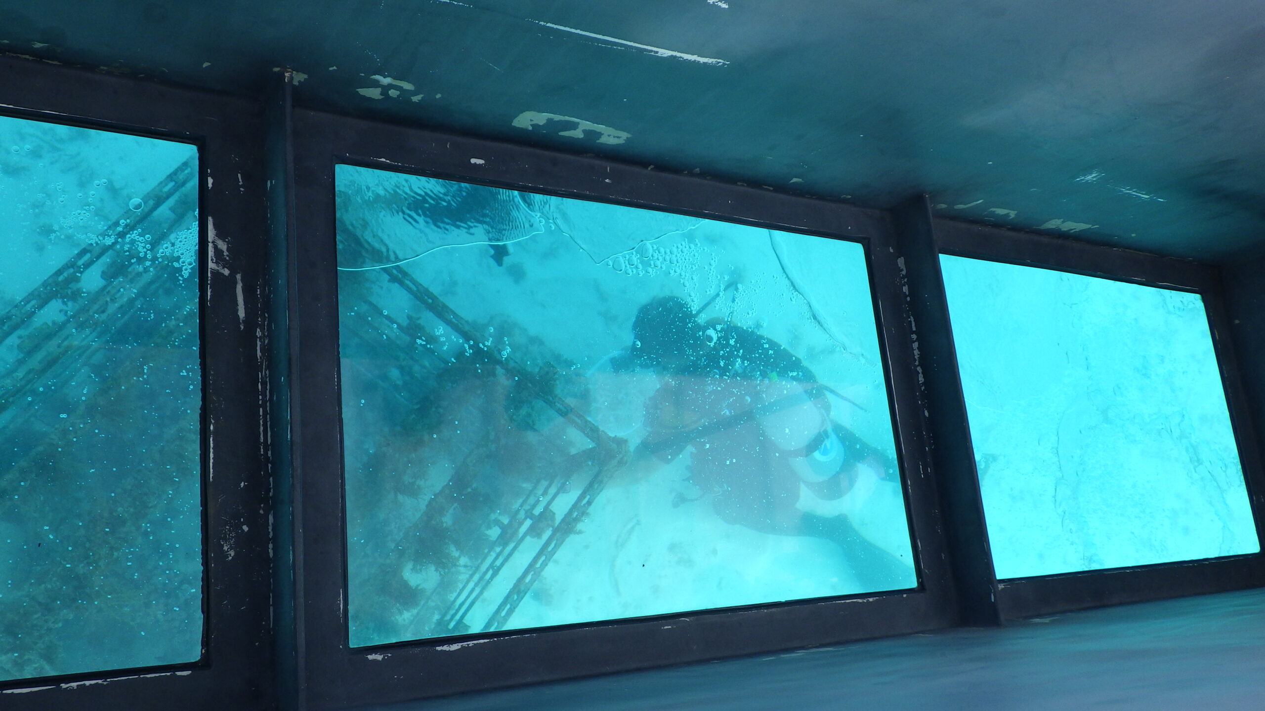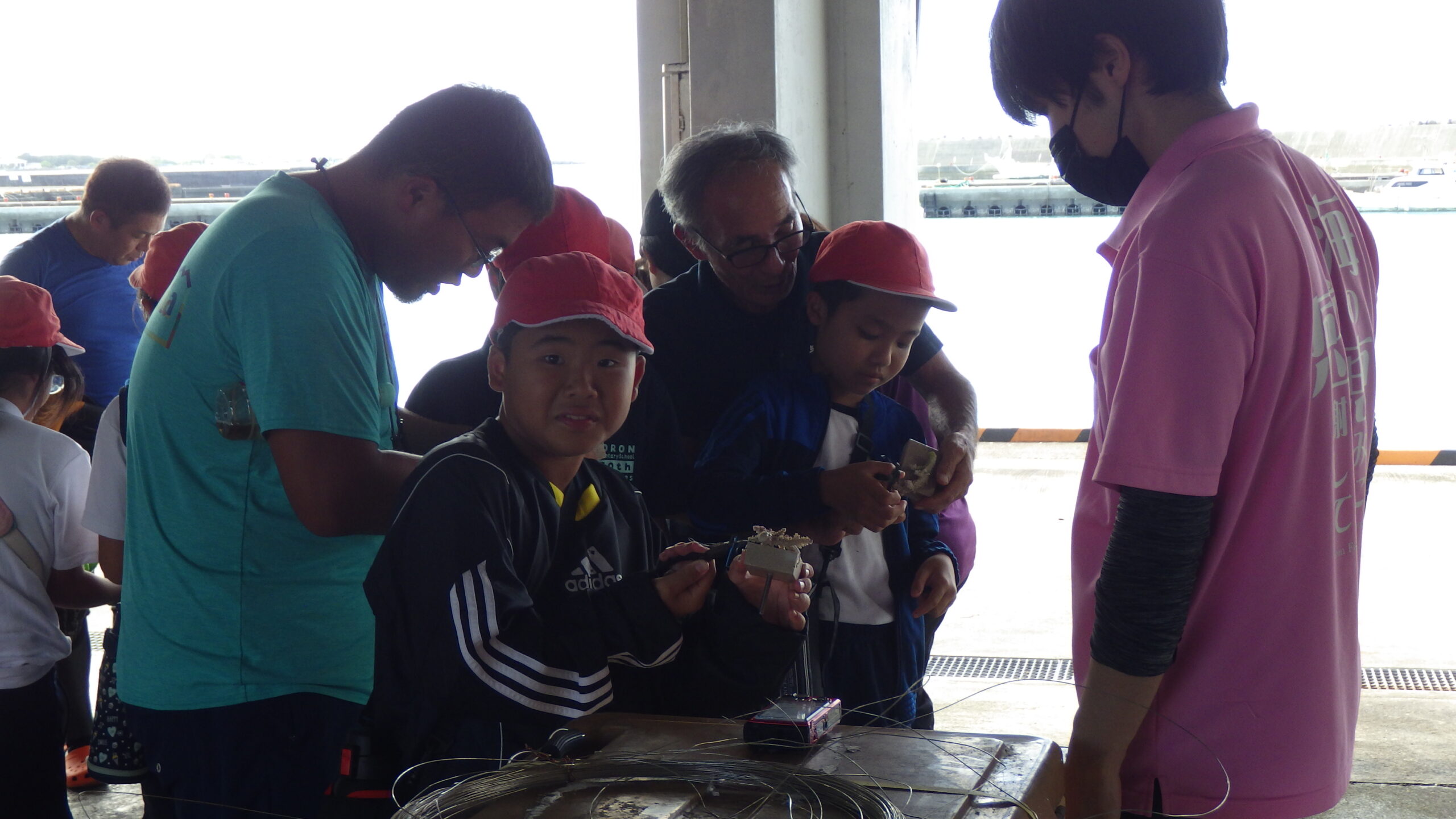 その後は、サンゴ増殖体験を実施しました。授業当日の朝に用意していただいたサンゴを、子どもたちはワイヤーを使ってブロックに固定。難しい作業でしたが、大人の力も借りながら全員が無事に完成させました。 そして、ダイバーさんがサンゴを海に設置する様子をグラスボート越しに観察。元気なサンゴや白化したサンゴ、色とりどりの魚たちが見えるたびに、子どもたちは「見つけた!」と楽しそうに声をあげていました。