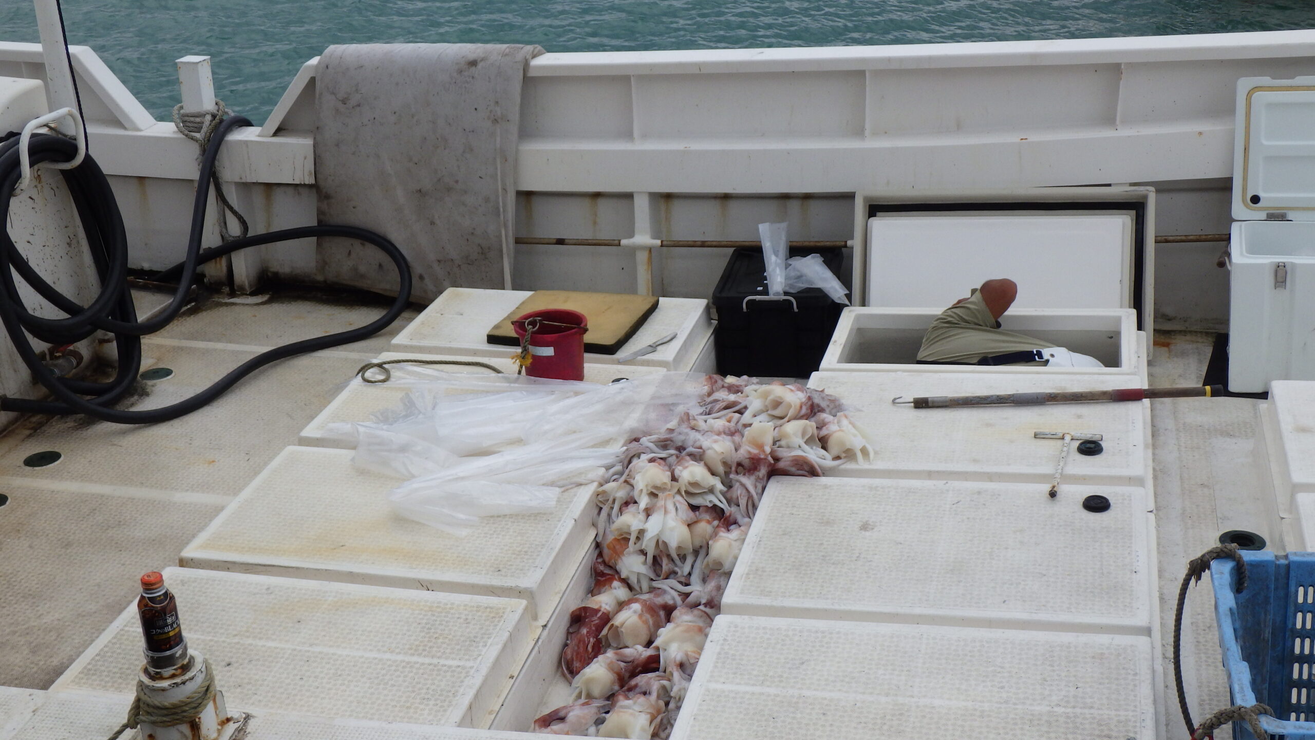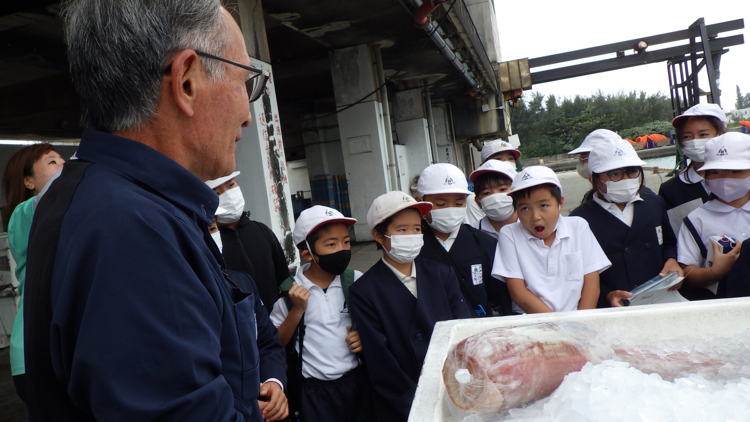 12/3は天候不良のためグラスボートが出航できませんでしたが、代わりに普段は立ち入れない漁協の裏側を見学させていただきました。巨大冷凍庫の中に入ったり、5日間の漁を終え帰港したばかりの大型漁船のソデイカを見せていただいたりと、子どもたちにとって特別な体験となりました。